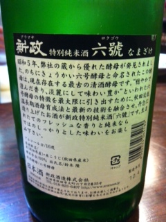 秋田の新政 特別純米 なまざけ 「六號」というお酒を一緒にいただきましたが、フルーティーな香りでのみやすくって、、、、危ないところでした。(笑)