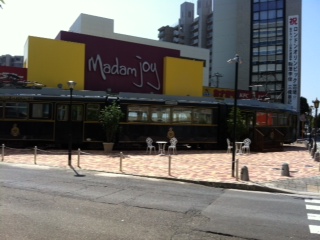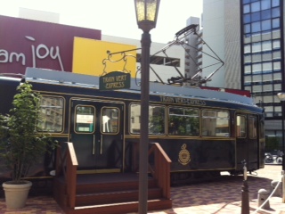 ふと、駅名をみると、、、もちろん広電本社前とかいてあるのですが、トランヴェールエクスプレスと書いてありました。なんだろう、、、、気になる、、、、、ふと広電本社のとなりにあるマダムジョイ(広電がやっているスーパー)を見ると、、、何やら大きな電車がおいてある、、なんでこんなところに、、、、