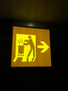そんなことはさておき、みなさんはこちらの標識をみたらどうされますか?左側はまあわかりますよね。こっちに避難しなさいよ〜〜〜の案内板ですね。では右側は?まず色がおかしいですね。そして、、、よ〜くみると、、、何かを煮ていますね。。。ということは、、、こっちにいくと煮られちゃう?(-。−;)