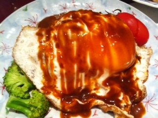 ハンバーグの上には半熟の目玉焼きをのっけてくれています。これを割って、ハンバーグと一緒にいただくと、、、たまらない〜〜〜〜!