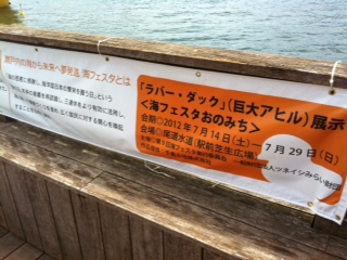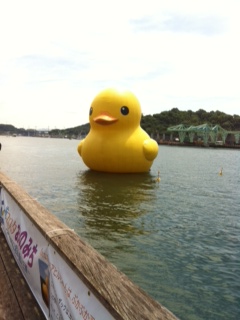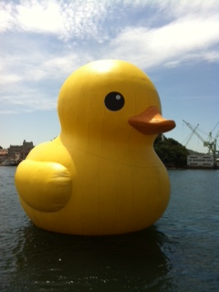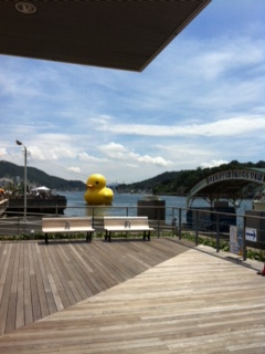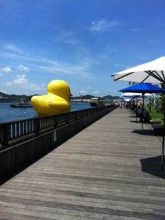なんと、大きさが高さ9.5m、幅9.5m、長さ11mというラバーダックちゃんです。で、でかい、、、、遠くから見ても相当大きいのでかなり目立ちますが、近くにいくと迫力に圧倒されます。みなさんもかなり喜んでいらっしゃいましたよ〜!