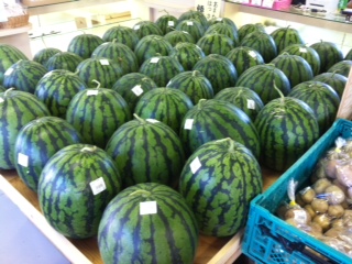駐車場には車が一台もとまっていなかったので、あれ?お休みかなと思ったのですが、行ってみるとあいていました。中に入ると、いきなりとっても大きくておいしそうなすいかがお出迎え!