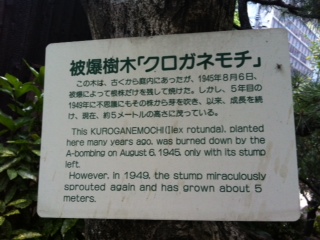さて、この頼山陽史料館にはこちらの木があることをご存じでしたか?こちらはクロガネモチという気で、なんと被爆している樹木なんですよ。このクロガネモチは古くからこちらの庭内にあったそうなのですが、昭和20年8月6日の被曝によって、根株だけを残して焼けてしまったそうです。