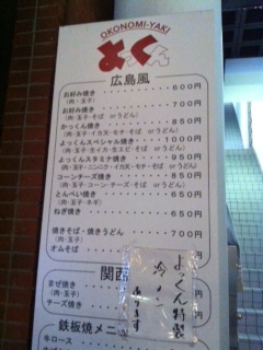 さて、先日友人と食事を共にしたあと、小腹がすいたということになり中四国最大の繁華街流川までいこうかということになりました。でも、、小雨がふっていてちょっと場所も離れていたので躊躇していると、、、目の前にお好み焼き屋さんの看板を発見。でも夜10時半くらいだったのであいていないかも、、、恐る恐る入ったのがこちらのよっくんでした。