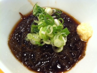 とりあえずは、沖縄からやってきたもずくからですね。このもずくがおいしいんですよね〜。三杯酢ではなくて、特製のダシで割ったポン酢でいただきます。