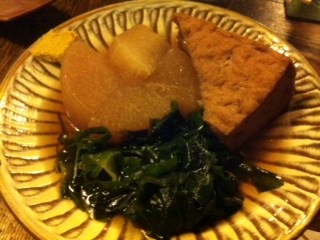 つづいて、お願いしたのが大根とがんもをいただきました!がんもが中まで味がしみていて、なんともいえない高級感を感じる逸品です。大根もいい歯ごたえしていますね〜。いや〜、幸せです。