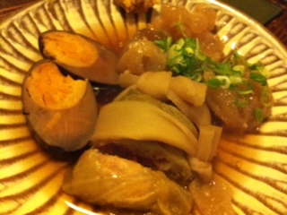 ロールキャベツ、たまご、すじをいただきました!ロールキャベツ立派ですね!すじもほどよい歯ごたえがたまりませんよ!