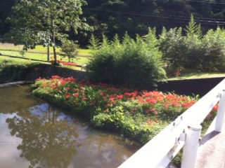 おおお!前回は一本も咲いていなかった入り口の橋のたもとにヒガンバナが咲き誇っていました!