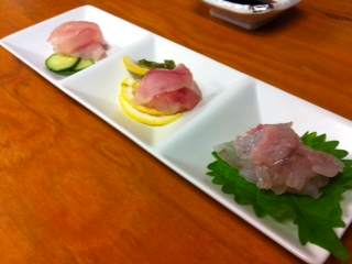 一杯だけいただいて帰ろうとおもったのですが、つきだしにお刺身が登場したのでもう一杯チーズの燻製と一緒にいただいて帰りました。