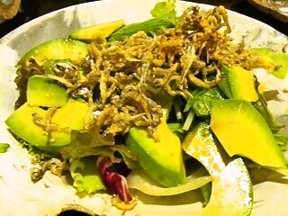 つづいてサラダでお願いしたアボカドと広島のちりめんじゃこのサラダ!ちりめんじゃこが揚げてあって、いいアクセントになっています!