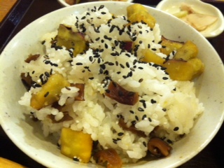 壁に貼ってあるメニューをみると、紅あずまと使った芋ごはんとかかれていたので興味津々!