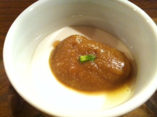 まずは先付けが焼茄子しょうゆをかけたお豆腐!焼きなすの風味がたまりませんね!