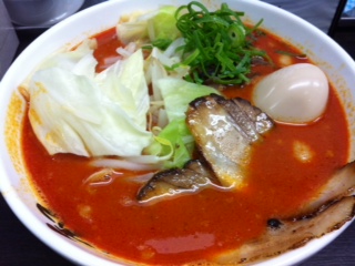 登場した辛みそらーめんの赤さが半端ない!す、すごい!真っ赤です!おそるおそる一口いただくと、、、、う、うまい!、、、、、からいーーーーーーー!きました!辛いです!