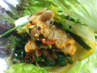 さて、今日のお昼に一度ご紹介いたしました家庭食房アリランさんの続きです。おいしいキムチ、チャンジャ、そしてケジャンをいただいたあとに登場したのが、、、