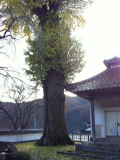 細い道を走っていくと、、、ありました!大銀杏!遠くからでもはっきり見えます!しかも散り始めていますが、まだまだ黄金色に輝くイチョウの葉を見ることができました!