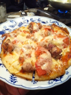 ということで、お酒もすすんできたのでさらにたべることに!地鶏のピザをいただきました!ピザ専門店も顔負けのおいしいピザでした!