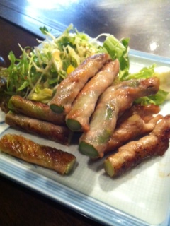 そんな中、もうすこし食べようかなということでアスパラ豚巻きをいただきます!しんごさんのアスパラはどこから仕入れているの?こんなアスパラあるの?というくらい長くて立派なアスパラを使っていらっしゃいます。その周りに豚肉を巻いてあり、焼き上げてから切り分けてくださいます。美味〜〜〜!