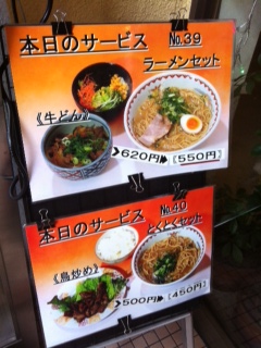 このびぜんやさんはなんといってもボリューム満点でさらに安い!最近ラーメン1杯が800円くらいしますよね。このびぜんやさん、、、、見てくださいこのサービスメニュー!本日のサービスとお店の正面に掲げられているメニュー、、、、ラーメンと鳥のいためもの、ライスがついて450円!もうひとつは、牛丼、サラダ、ラーメンがついて550円!