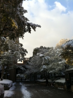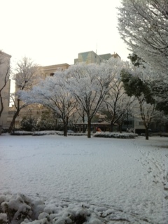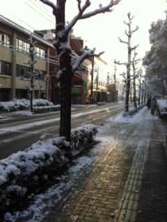 ちょっと早く家をでてあたりを散策してみました。マンションの外にでたら、あたり一面が雪、雪、雪!道路も凍っていました!これほど凍っていたら車の運転も大変でしょうね。