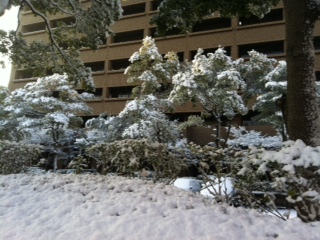 広島市役所に行ってみると、市役所前の木々に雪が積もっていてとってもきれいな景色になっていました。銀世界とはこのことですね〜。