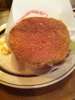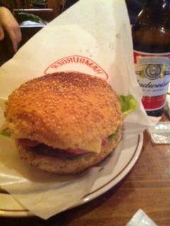 登場したバーガーをみて、、、おっきい〜〜〜〜!パークサイドホテル広島の近所にありますアメリカンダイナーKemby'sのハンバーガーと同じくらいの大きさがあります!