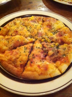 最後はミックスピザを!このピザがまた熱々でおいしいんですよね〜。パン生地がしっかりしているので、食べごたえがありました!