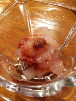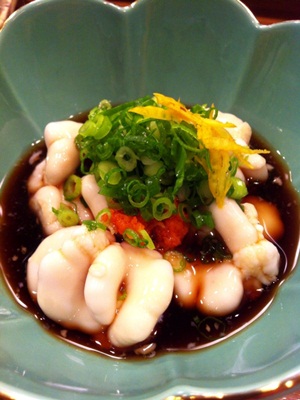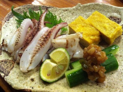 大将がサービスでつくってくださった、イカの和え物です。これがまたお酒にあう〜〜〜!