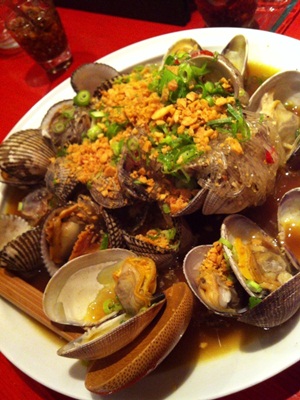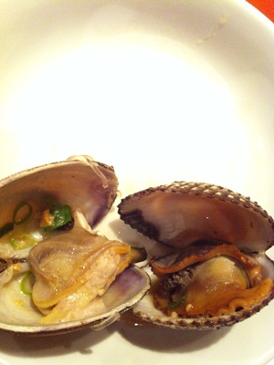 この日は貝がいいというので、いきなりこんな豪華な貝料理が!大粒のあさりと子赤貝です!いい香りがたちこめます!あさりがとっても大きいのにはびっくりしちゃいました!