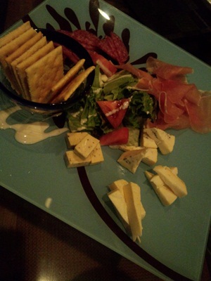 かっこよくレッドアイなどをお願いしつつ、お料理を何品かお願いしました。まずはオードブルから。生ハムやチーズなどが盛り合わせてありました。このお店の雰囲気にとってもあいますね〜!
