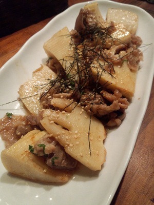 つづいてタケノコと豚しそ炒め!しその風味とタケノコあいます〜〜〜!すばらし〜〜〜!タケノコ大好きなのでソッコーで平らげました。こんな立派なタケノコなかなかお目にかかれませんね〜。