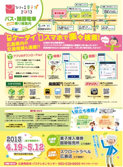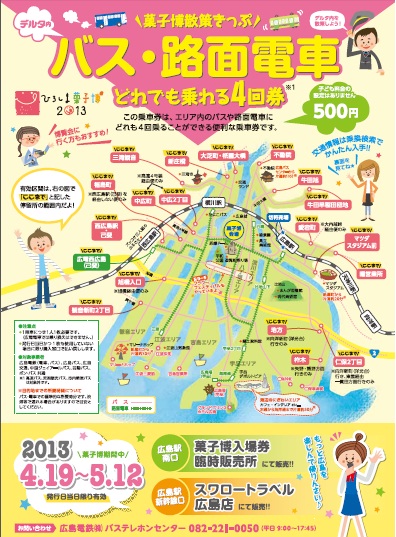 「第26回全国菓子大博覧会・広島の開催にあたり、広島県公共交通移動活発化検討会のご協力のもと、会場のエリア内のバスや路面電車にどれも4回乗ることができる便利な共通乗車券「菓子博散策きっぷ」を販売します。」
