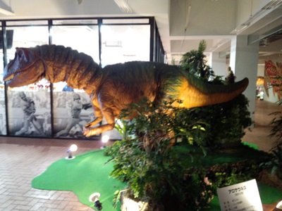 なんと本物の恐竜かとおもわんばかりの精巧な恐竜たちが!しかも動いています!ひょっとして、、、ウォーキングwithダイナソーの関係でしょうか?こちらには3体いました!球場入り口にもう一体いたそうです。