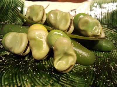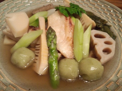 蒸し空豆をいただきながら、日本酒を楽しみました!つづいて竹の子、アスパラ、天然鯛の煮浸しをいただきました!こちらも旬を感じさせるすばらしい一品です!