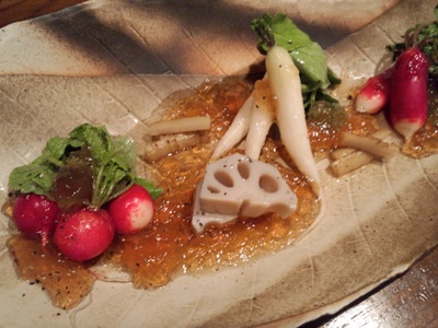 広島県は弥栄産の二十日大根などのジュレがけをいただきました。野菜生きてますね〜!