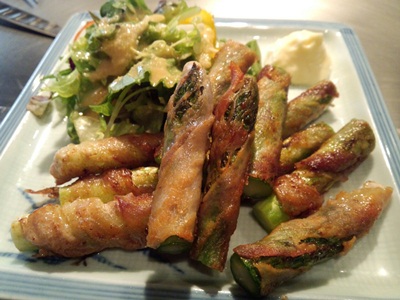 つづいて最近必ず頼んでいるのがアスパラ豚巻きです。こんな立派なアスパラどこにあるの?というくらい太くて大きいアスパラに丁寧に豚肉を巻いて焼いてくださいます。しゃきしゃきいsた食感がたまらないです!