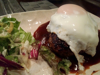 最後は、、、チャーハン、、、じゃなくて、、、ハンバーグ!ハンバーグを割るとじゅわ〜っと肉汁があふれてきます!半熟の卵焼きを割っていただくとなおおいしい!