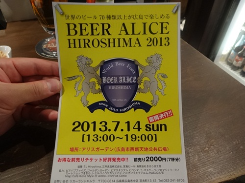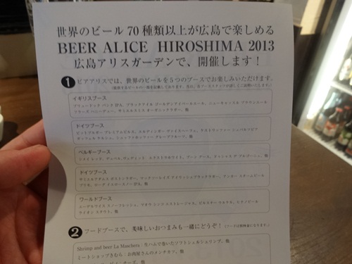 そんななかこんなチラシを見せてくださいました!その名もBEER ALICE HIROSHIMA2013です。こちらはなんと世界のビール70種類以上が楽しめちゃうイベントなんです!