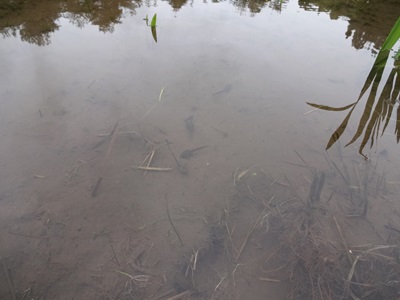 土と色がかぶって最初はわからなかったのですが、よ〜く目を凝らしてみてみると、、、これまたすんごい数のおたまじゃくしが元気に泳いでいましたよ。