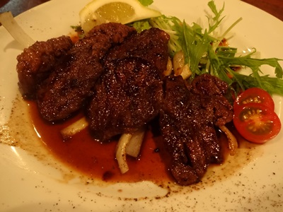 そして、、、誘惑の誘いにのって両方お願いすることにしました。まずは国産牛のサガリ一口ステーキから!登場したステーキが、、、これまたいい色合いをしているんですよ!香りもいいですね〜!一口いただくと、、、ちょうどいいやわらかさ!そして、、肉汁があふれでてきます!これぞサガリ!