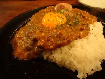 〆には以前気になっていたドライカレーを!真ん中にちょこんとのっている卵をしっかりまぜて一口いただくと、、、ふっふっふ!ドライカレー最高じゃないですか!