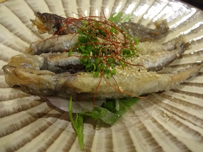 つづいて、ししゃもの南蛮漬けをいただきました!ししゃもも南蛮漬けにするんですね〜、いただいてみると、、おお!おいしい〜!やさしいお味です。ここで日本酒にチェンジ!あまりに日本酒の種類が多くて迷っちゃったので、ご主人におすすめをお願いしました〜!