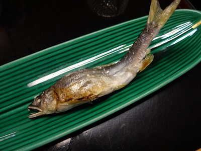 それでは昨日のすき焼きの続きからご紹介いたします。すき焼きの後に、登場したのはなんと鮎!鮎と蓼酢が登場しました。