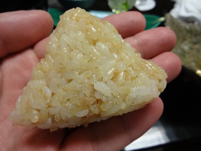 と、ここで、、、一度下がっていらっしゃったご主人がさきほどのごはんの釜をかかえてもどってこられて、、何が始まるのかなとおもったら、、、なんとご主人自ら残ったごはんをおにぎりにしてくださいました。一つ一つ握られて各自のところへもってきてくださり、手の上にやさしくのせてくださいました。これまた感動です。おもわず立ち上がろうとしたくらいです。