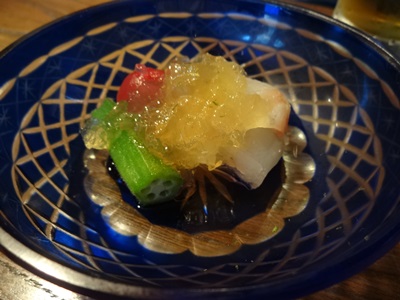 まずは先付けから!スズキの昆布〆とトマトとオクラのジュレかけが登場しました!