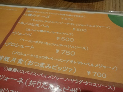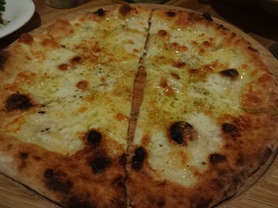 こちらはチーズのピザ!もっちもちでおいしい!こういうピザはひょっとしたらさめてもおいしいのではないかとおもって、、こっそり一枚残しておきました。さめたところで食べてみると、、、うまい!これはすごい!ふとメニューをみるとお持ち帰りもできるようです!