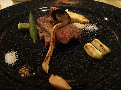 メインの2品目、お肉が登場しました!ここでワインも赤ワインにチェンジ!お肉は九州の黒毛和牛で放牧されて育っているんだそうです。とってもおいしい〜〜〜!