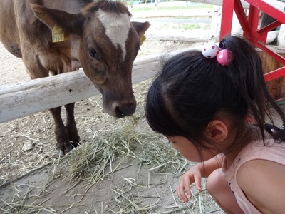 牛さんをよしよししながら、えさを食べてもらって、、