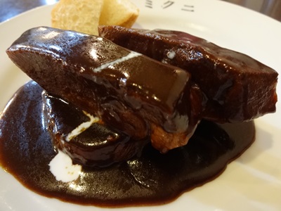 さっそく登場した和牛タンのタンシチューをいただきます!やはりまずナイフとフォークで、、、、いりませんよ。ナイフとフォーク。お箸で十分です。卵の黄身を箸で割るような感覚で、タンが分かれてくれます。さすが広島県産の和牛タンですね〜!