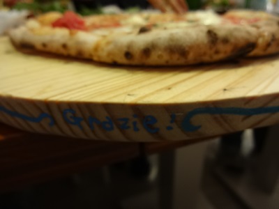 ピザをのせてあるこの板もかわいかったです。板の横にはおそらくグラッツェと書かれているんだと思います。ありがとう!の気持ちがこめられているんですね〜。