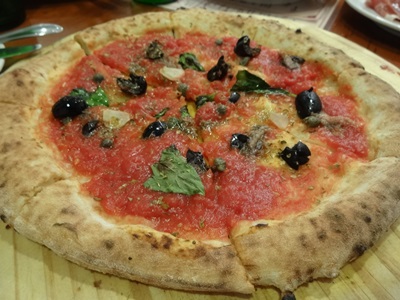 そのほかのピザも食べれるだけ食べよう!ということになって勢いがついて、どんどん注文!つづいて登場したのが、シチリアーナ!オリーブがしっかりきいていますよ〜!おいしいですね〜!